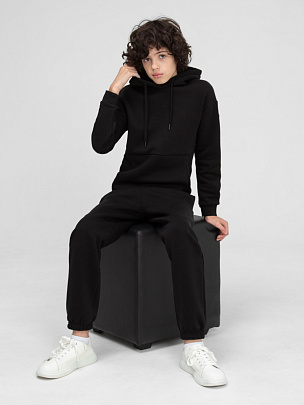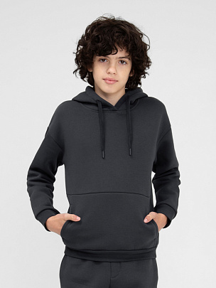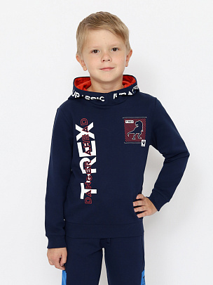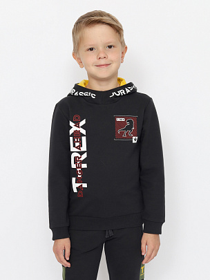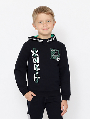 Толстовка с длинными рукавами, притачными планками по низу изделия и рукава. Капюшон с подкладкой и декоративным шнурком. Перед декорирован принтом "Перерабатывай и используй повторно".