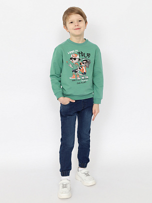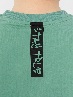 Джемпер с длинными рукавами и притачным поясом. Рукава втачные с манжетами по низу. Воротник, манжеты и пояс выполнены из полотна с эластаном. Перед и спинка декорированы принтом "Оставайся хладнокровным, следуй своим собственным правилам".