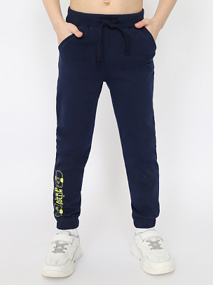 Брюки с притачным поясом и манжетами. Пояс из полотна с добавлением лайкры и эластичной резинкой внутри. Низ брюк с эластичной резинкой внутри. Передняя половинка брюк декорирована принтом "Продолжай катиться".