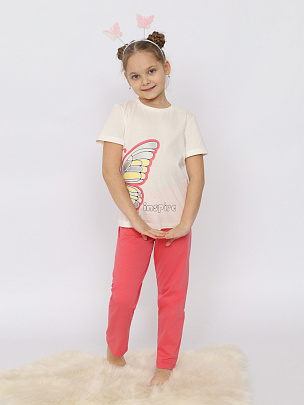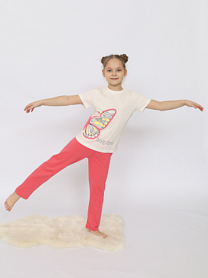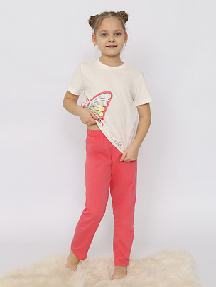 Пижама гладкокрашенная из футболки и брюк. Футболка свободного покроя с коротким рукавом. Горловина обработана притачной бейкой из рибаны с лайкрой. На правом боку принт в виде бабочки. Прямые брюки умеренного объёма выполнены из полотна дополнительного цвета. Цельнокроенный пояс обработан плоским швом вподгибку с одновременным прокладыванием резинки.