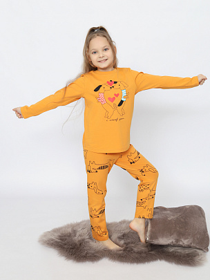 Комбинированная пижама из джемпера и брюк. Джемпер гладкокрашенный, свободного покроя с длинным рукавом. Горловина обработана притачной бейкой из рибаны с лайкрой. Перед оформлен принтом. Прямые брюки умеренного объёма выполнены из набивного полотна. Цельнокроенный пояс обработан плоским швом вподгибку с одновременным прокладыванием резинки.