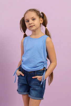 Футболка со спущенным плечом и короткими рукавами. Спереди карман декорирован ришелье. Горловина круглая, обработана притачной бейкой. По ростку горловины шов притачивания закрыт долевиком.