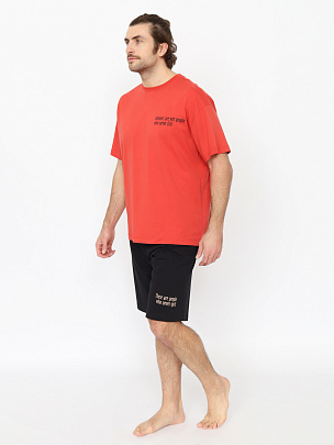 Гладкокрашенная пижама из футболки и шорт. Футболка свободного покроя с коротким рукавом. Горловина обработана притачной бейкой из рибаны с лайкрой. Перед оформлен небольшим принтом. Шорты свободного покроя длиной ниже колена выполнены из полотна дополнительного цвета. Цельнокроенный пояс обработан плоским швом вподгибку с одновременным прокладыванием резинки. На левой половинке внизу небольшой принт.