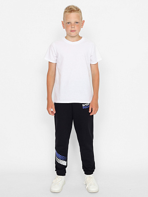 Брюки для мальчика с карманами. Пояс притачной, с резинкой и функциональным шнуром. Нижние срезы брюк на резинке. В области левого кармана небольшой принт "СПОРТИВНАЯ КОМАНДА"с эффектом высокой базы. Правая половинка брюк декорирована принтом.
