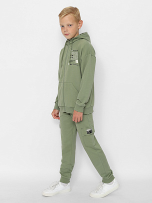 Брюки для мальчика с накладными карманами с клапаном. Нижние срезы брюк оформлены притачными манжетами из полотна с эластаном. Пояс притачной, с резинкой и функциональным шнуром. На карман настрочена декоративная жаккардовая этикетка.