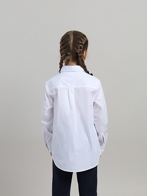 Классическая блузка из хлопка, свободного силуэта с отложным воротником и длинными рукавами с манжетами. Застёжка центральная на планку с пуговицами, декорирована принтом ввиде надписей на полочках.