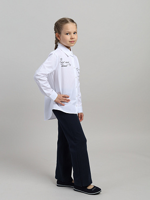 Классическая блузка из хлопка, свободного силуэта с отложным воротником и длинными рукавами с манжетами. Застёжка центральная на планку с пуговицами, декорирована принтом ввиде надписей на полочках.