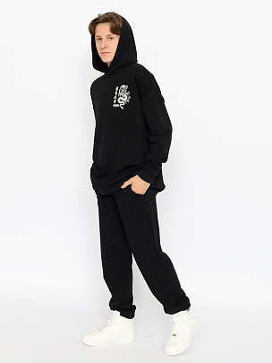 Молодежная толстовка oversize с капюшоном. Рукава длинные, с манжетами по низу. Нижние срезы переда и спинки оформлены притачным поясом. Манжеты и пояс выполнены из полотна с эластаном. Перед и спинка толстовки декорированы принтом (9 сыновей дракона).