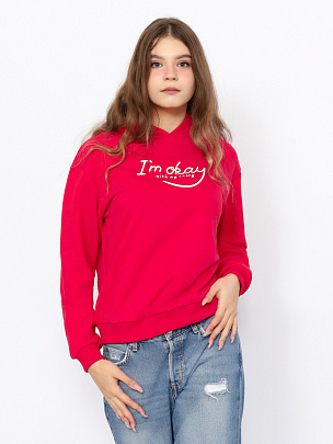 Толстовка для девушки с капюшоном и длинными рукавами из плотного трикотажа без начеса. Рукава с манжетами по низу. Притачной пояс и манжеты выполнены из полотна с эластаном. Перед толстовки декорирован принтом (я в порядке).